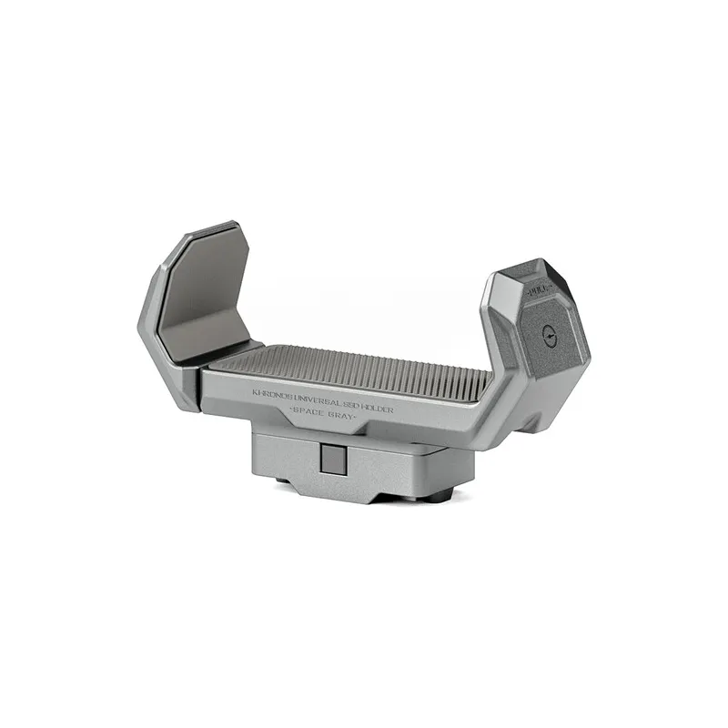 The Tilta Khronos Universal SSD Holder in Titanium White allows you to mount an external SSD or other accessory to your Khronos Case for iPhone 15 Pro or Pro Max. It securely fits devices that are 1.96 to 2.75 inches wide and up to 0.59 inches tall, providing a versatile solution for mobile filmmakers.