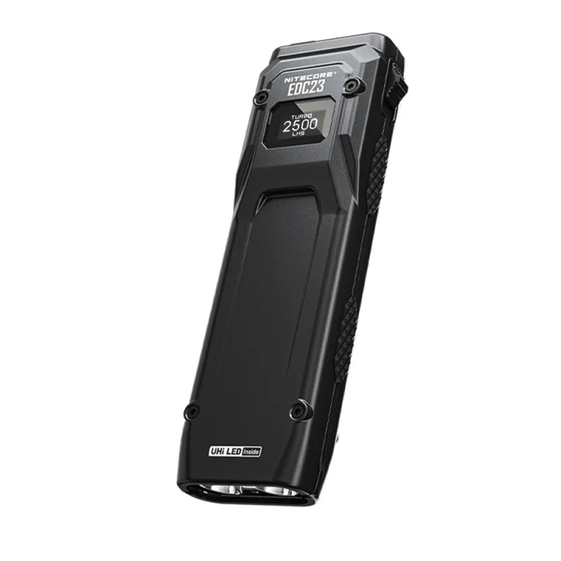 The EDC23 features UHi 25 LED technology for bright, accurate illumination at 6500K. The multifunction OLED display shows brightness levels, battery status, and runtime, while Rapid Lock and tactical controls ensure quick response in critical situations.