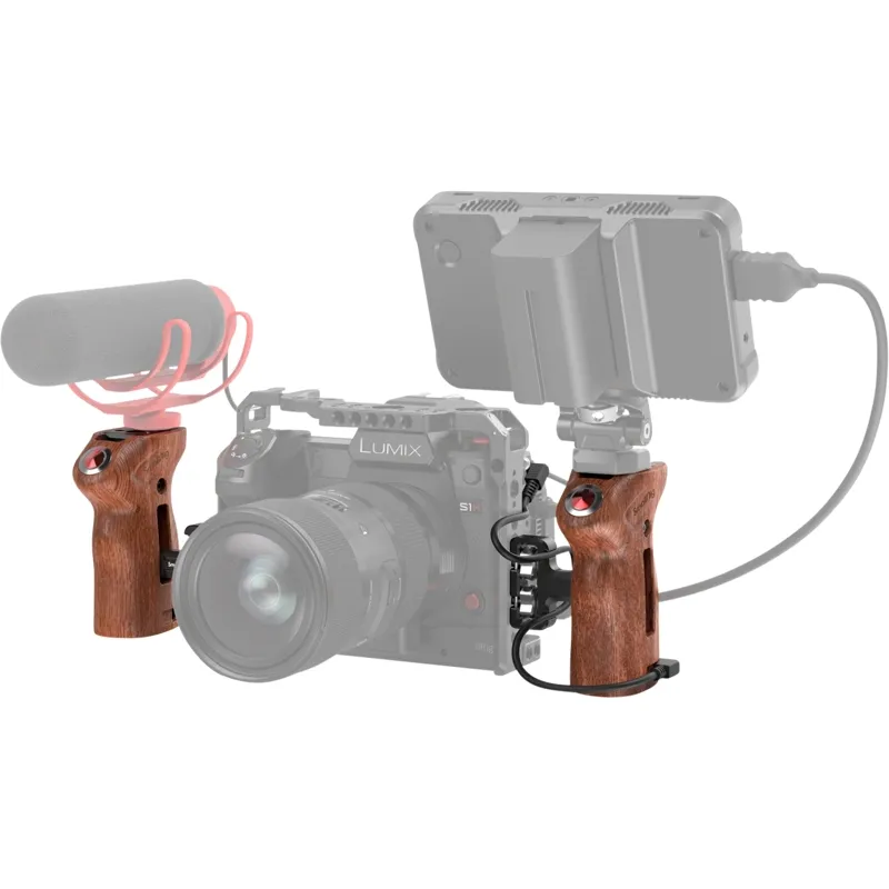 SmallRig Threaded Side Handle with Record Start/Stop Remote Trigger 3323 is designed to provide convenient record start/stop control for a stable and comfortable shooting experience. Ergonomically-designed, all-in-one wood handle improves grip experience. It firmly secures to a cage with two 1/4"-20 threads and adjustable height. Its top features 1/4"-20, 3/8"-16 threaded holes and a cold shoe for Monitor Mount 2904 and 2905; its built-in spanner allows for easy disassembly and assembly of accessories. It is equipped with three control cables, supporting Sony A7II/A7III/A7 IV/A6000/A6500, FUJIFILM X-T3/X-T4/X-T20/X-T30, Panasonic GH5/5S/GH6/G9/G95/S5/S1/S1R/S1/BGH1/BS1H and Z CAM E2/M4/S6. Add a longer Control Cable ID:3407 which is sold separately to your shoulder kit for Sony cameras. The handle is compatible with the following cameras: