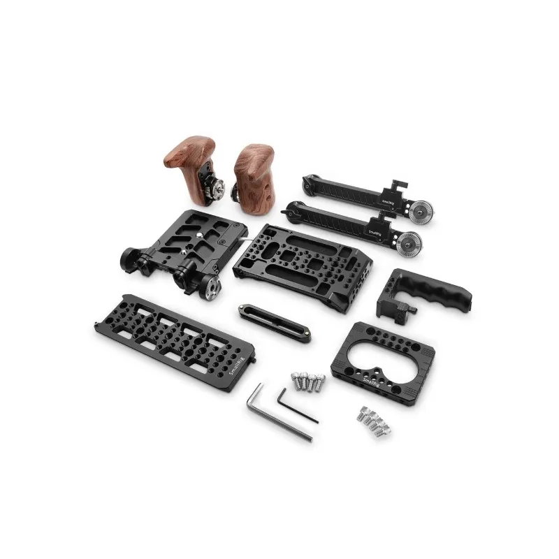 SmallRig Professional Accessory Kit for RED DSMC2 2102 includes NATO Top Handle 1961, Top Plate 1748, Arri Baseplate 1998, Arri Plate 1501, Shoulder Pad 2057, Extension Arm with Arri Rosette 1870, Left Side Wooden Grip 1891 and Right Side Wooden Grip 1941. It offers lots of additional attachment options and enables the camera to release its potential to the utmost as per the needs of cameraman during shooting.