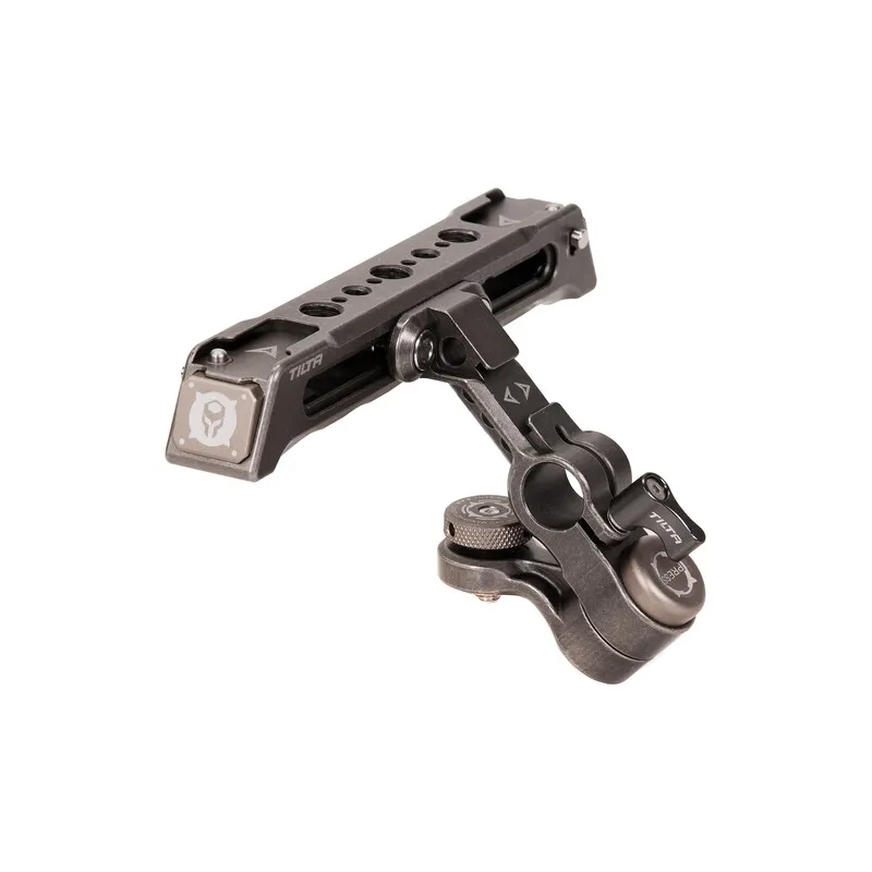 Crafted in a tactical gray hue, the Adjustable Top Handle is specifically crafted for attachment to a rosette located on the upper side of the Tilta camera cage designed for the RED KOMODO. It provides flexibility by allowing users to set their preferred tilt angle using the rosette while also offering a 360 rotation feature facilitated by a dedicated articulation point. This handle is versatile, allowing adjustment to the side or even the bottom of the cage when not needed at the top. Furthermore, it includes a shoe mount with a safety pin and a solitary 15mm rod port for the attachment of extra accessories, utilizing an optional rod.