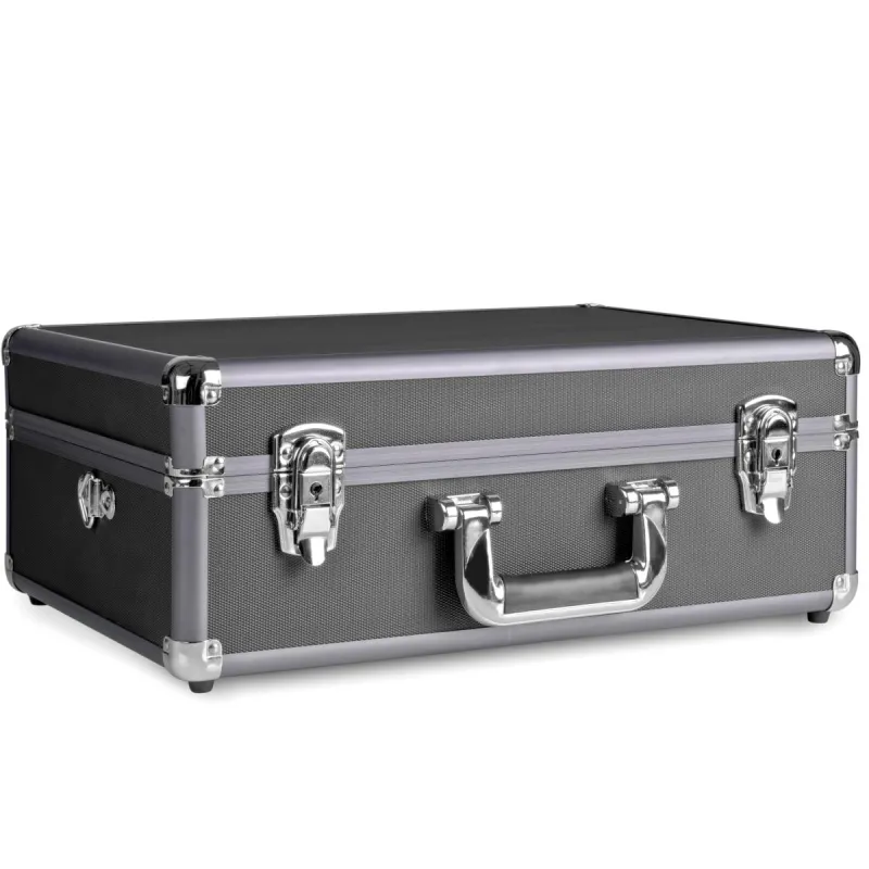 The workmanship of the photo case is excellent and offers sufficient space for a large SLR camera, digicams, or digital cameras with accessories. The base and top areas are well padded, the individual adaptation of the compartments is carried out via rods or foam padding. In particular the case is characterised by its solid and sturdy but nevertheless weight-saving workmanship. It is protected against splash water by a circular aluminium seam, and can be locked twice. All outer edges are rounded off and reinforced with aluminium caps. The lid has a very sturdy hinge with an integrated impact protection and the base has four plastic feet for the safe parking of the camera case.