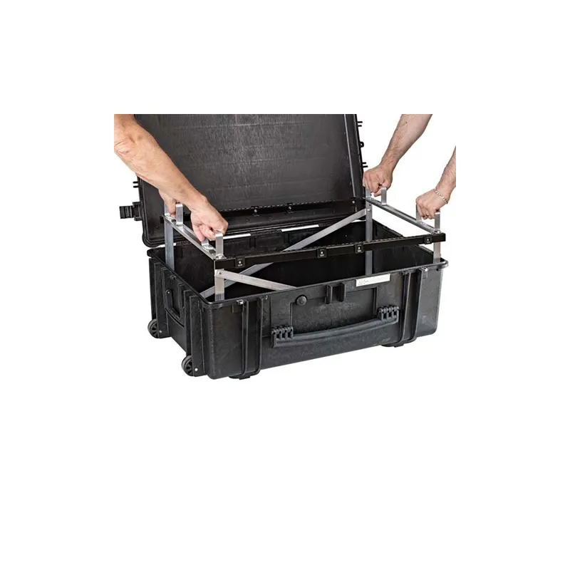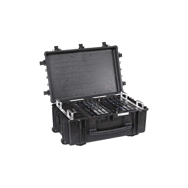 The Explorer Cases 7630.B.15U is a fully waterproof trolley case with an aluminum Rack Frame for 19" equipment. 19 Inch is a standardized width dimension for certain electronic equipment (see heading 'Application'). You can safely mount these devices in the rack using the 'slots' on both sides of the rack. The interior dimensions of the case are 76.5 x 48.5 x 30.5 cm; the exterior dimensions are 86 x 56 x 35.5 cm.