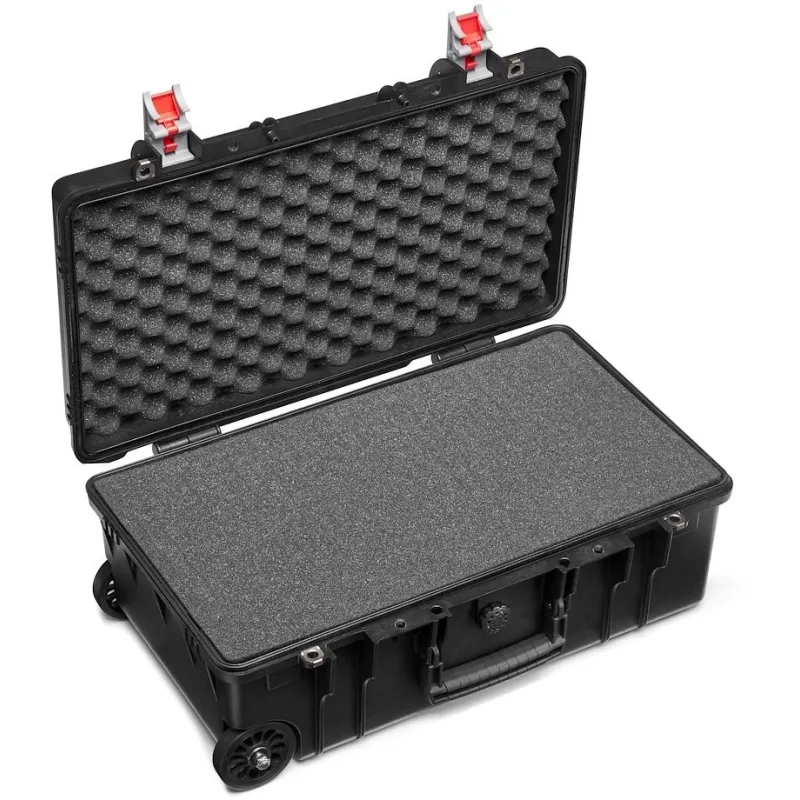 They are IP67 tested meaning that there is no ingress of dust and withstands temporary immersion in water for 30 minutes. Manufactured and designed in Italy, the Tough H-55 is ideal for travellers who do not want to compromise between safety and portability. This case fits airline carry-on size restrictions* and is provided with a two stage telescopic handle with self-locking system to prevent unwanted opening when carrying and transporting, and the automatic pressure release valve provides automatic regulation of the interior air pressure when on a flight. The two wheels have a larger diameter, silent and stable during transport, giving optimal stability, strength, and made to be durable to last over time. The new PRO Light Reloader Tough H-55 is provided with 4 layers of pre-cubed foam and convoluted foam for the lid. The convoluted foam in the lid helps to firmly keep the stored equipment when the case is closed. The 4 layers of pre-cubed foam allows you to customize the insert to your own indsividual equipment and the four layers help for an easier initial setup and arrangement. The Tough H-55 features exclusive design functions that make it compatible with Manfrotto Tough Modular accessories. Four metal pins allow you to easily attach Tough Tripod bag and laptop bag (sold separately) for a more modular carrying experience.