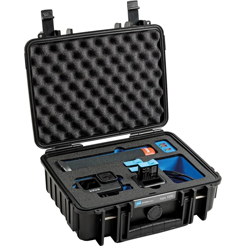THE case for your GoPro Actioncam + Accessories! Thanks to its custom foam insert it provides sufficient space for your GoPro Hero 9 and the accessories: the dual battery charger, up to 3 batteries, floating hand grip, up to 7 microSD memory cards, mounting brackets and cables. The spares compartment (92 x 62 x 57 mm) offers space for additional accessories and it is possible to charge two batteries directly in the case.