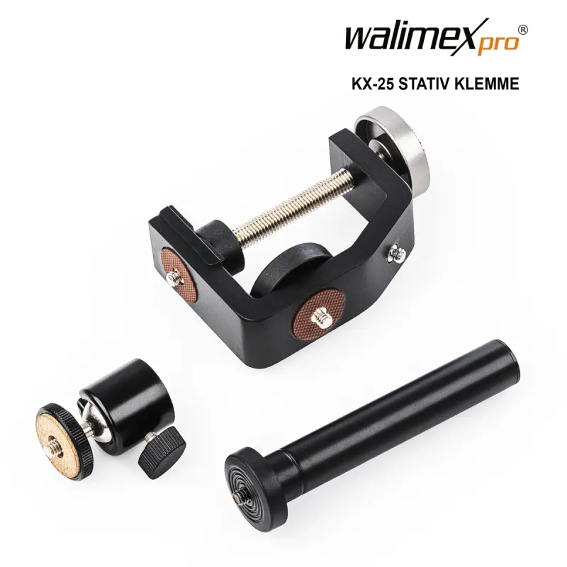 Whether camera, LED light, flash system or compact flash, microphone, smartphone or ActionCam - with the Walimex pro KX-25 Clamp Stand your equipment will find the right position everywhere. Due to the universal and very practical construction you will find a secure hold anywhere. This makes this clamp ideal for use on tripods, tubes, tops, doors, tables and many other objects.