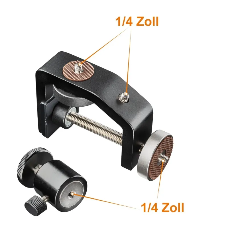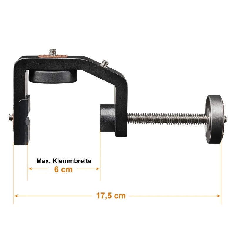 Where tripods and monopods are out of the question due to their size or you simply need an extremely versatile and practical clamp, the KX-25 Stand Clamp will help you reliably and conveniently. Thanks to the extremely solid clamping device, the clamp can be attached to almost all objects such as tubes, light stands tripods, railings, table edges, shooting tables and much more. The clamp can be easily adjusted from 0 to 6 cm in the clamping width by means of a screw fastener. The high-strength aluminium alloy and stable clamping jaws with profile thicknesses of 1 cm ensure convincing stability and durability for the KX-25. This allows you to attach equipment up to 6 kg very reliably and comfortably in the desired position.