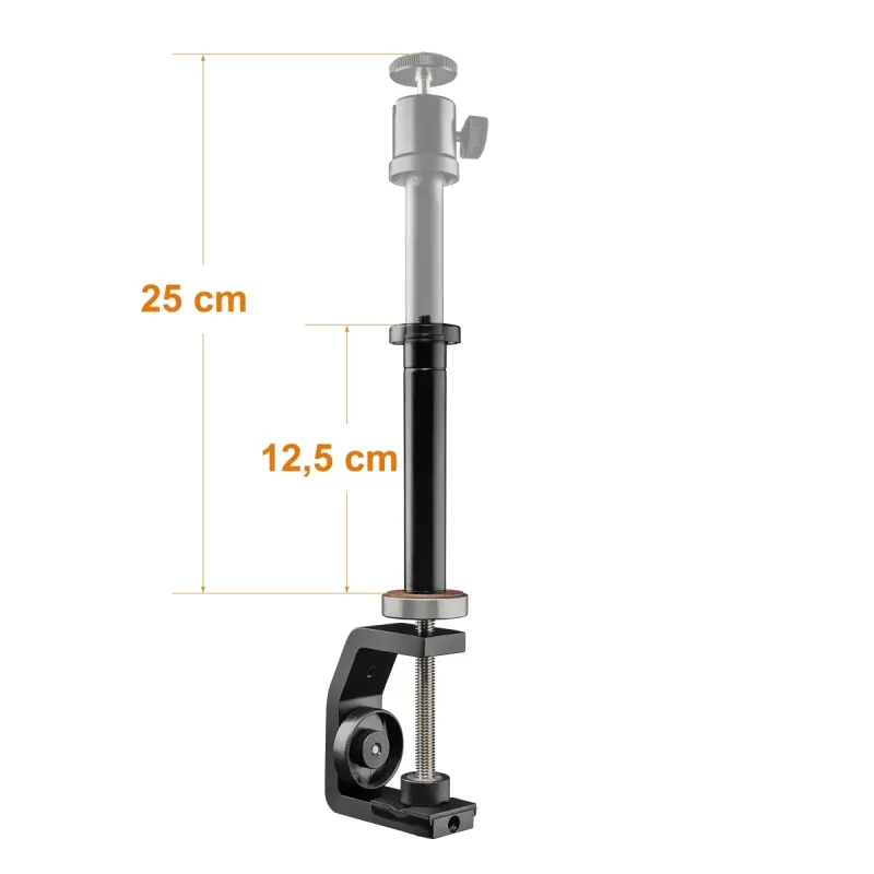 The supplied ball head makes this clamp even more versatile. The mini ball head is made of aluminium and is 5 cm high. After mounting the ball head, the maximum pull-out height of the centre column increases to 25 cm. The ball head has a load capacity of up to 1.5 kg and allows the mounted equipment to be precisely aligned in any desired position.