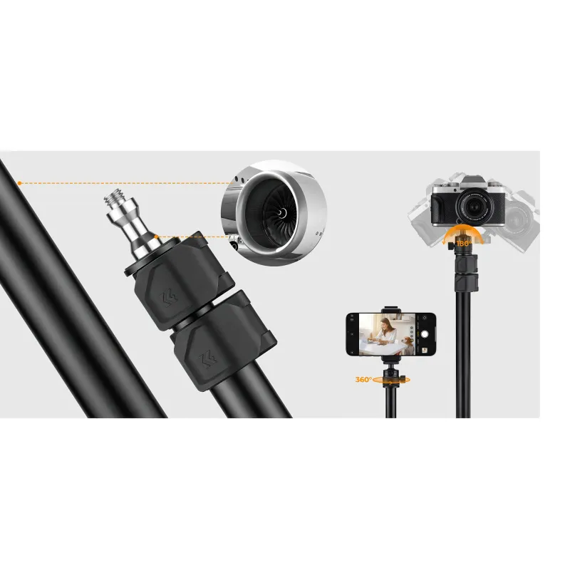 The K&F Concept C-Clamp Desktop Stand comes with a ball head that offers 360 rotation and -90 to +90 tilt. This allows you to quickly change the camera orientation from horizontal to vertical and precisely set the shooting angle. The head supports a standard 1/4 thread, allowing you to mount cameras, camcorders, LED lights, phone holders, or microphones. The included 1/4 to 3/8 adapter extends compatibility to larger ring lights or LED panels.