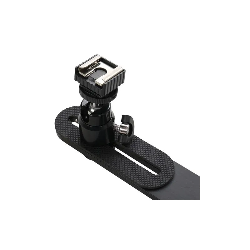 The Falcon Eyes PBC-200HHC Camera Bracket can be mounted to a light stand or tripod with either a or 3/8 male thread. The PBC-200HHC consists of 2 male thread connections and a mini ball head and hotshoe which can be mounted onto one of the male thread connections. A speedlite or additional flash unit can be attached to the other male thread.