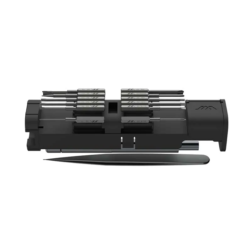 The set includes a handle, 14 bits, tweezers, and a robust case with magnetizer and screw holder, ideal for small electronics maintenance. Perfect for assembling and disassembling smartphones, toys, or other devices.