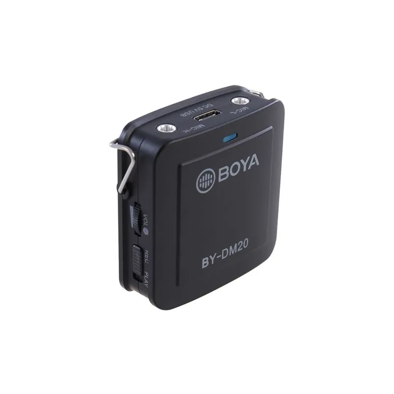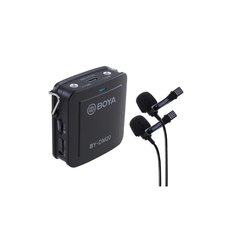 The Boya BY-DM20 is a duo lavalier microphone, suitable for iOS, Android (usb-c), PCs and laptops. You can connect the BY-DM20 to your device using the included Lightning cable, USB-c cable or USB-a cable. The two supplied lavalier microphones can be connected to the BY-DM20 using the 3.5 mm cable.