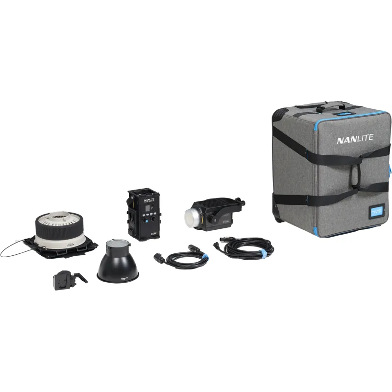 The Forza 300B II is a compact and lightweight LED spotlight that delivers an impressive 68,060 Lux (6,323 fc) at 1 meter, 5600K, with the included reflector. It features a versatile CCT range of 2700K-6500K, durable construction, and multiple control options including Bluetooth, 2.4G, and DMX/RDM. The kit includes a frosted-glass protected COB, a redesigned yoke, and a Control Unit that operates on AC or V-Mount batteries (sold separately).