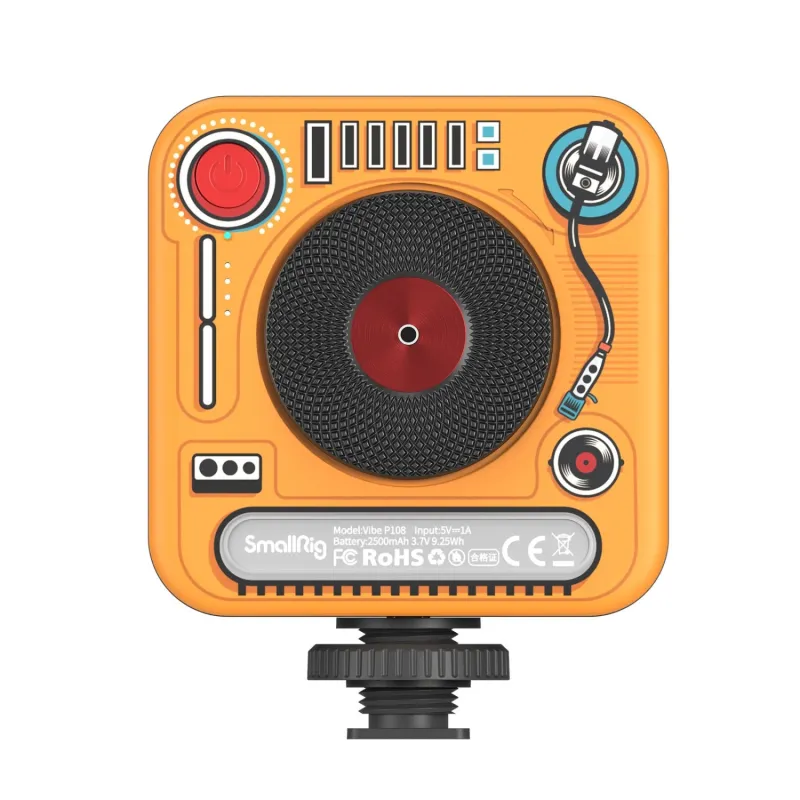 The unique Phonograph Limited Edition Vibe P108 Full Color Mini LED Video Light from SmallRig is made with creators, video producers, and vloggers in mind. It provides a full RGB color range in a pocket-sized light and runs for up to 130 minutes on a full charge of its internal Li-ion battery.