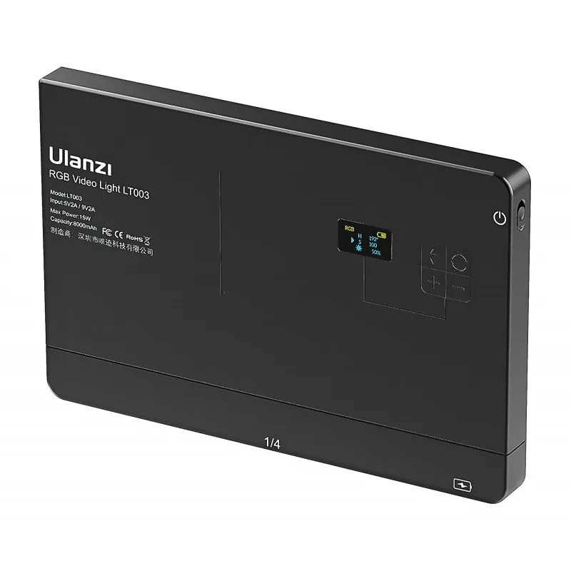The Ulanzi LT003 – RGB, WB (2500 K – 9000 K) is a slim LED light measuring 25 x 16.5 cm. The unit will be an excellent choice for product photography, portraits, vlogs or live broadcasts. The model presented here offers a wide range of light colour temperature adjustment (from 2500 K to 9000 K), the ability to change colour within the HSI colour space, as well as 20 preset special effects. Ergonomic pushbuttons allow you to quickly switch between different settings, and the backlit OLED screen makes work even easier. The lamp is powered by a built-in rechargeable battery, which provides up to 10 hours of uninterrupted operation. The housing did not lack a 1/4″ thread and the popular USB-C port for convenient charging.
