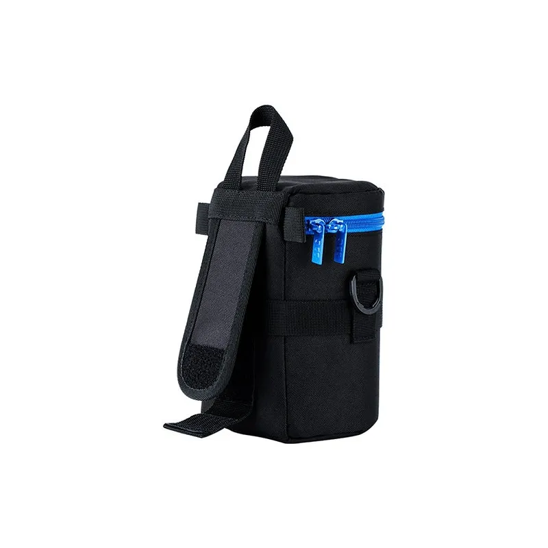 JJC Deluxe Lens Pouch is designed to carry a typical SLR lens. This pouch features heavy-duty polyester construction with a foam cushion interior. It provides great protection and shock absorption for your lens. Besides, its exterior material is water-resistant, which can protect your lens from rain and moisture. It has deep blue two way zipper with a mesh accessory pocket inside the lid. The two zipper sliders are designed with small loops, thus you can lock them together with a small lock for security. You can put the small accessory, such as lens cap or remote controller, into the inside pocket. Features 4 carrying options: 2 D-rings with a strap to be used as a shoulder strap, 2 webbed eyelet loops for a shoulder strap, rear double touch belt loop for use on waist belt and a grab handle on the top for convenience. In addition, the narrowed rear double touch belt loop also fits Lowepro belt. The deep blue zipper coordinate with the JJC logo, which makes the pouch fashionable. This series of lens pouches is available in 7 sizes to fit a wide variety of lenses.