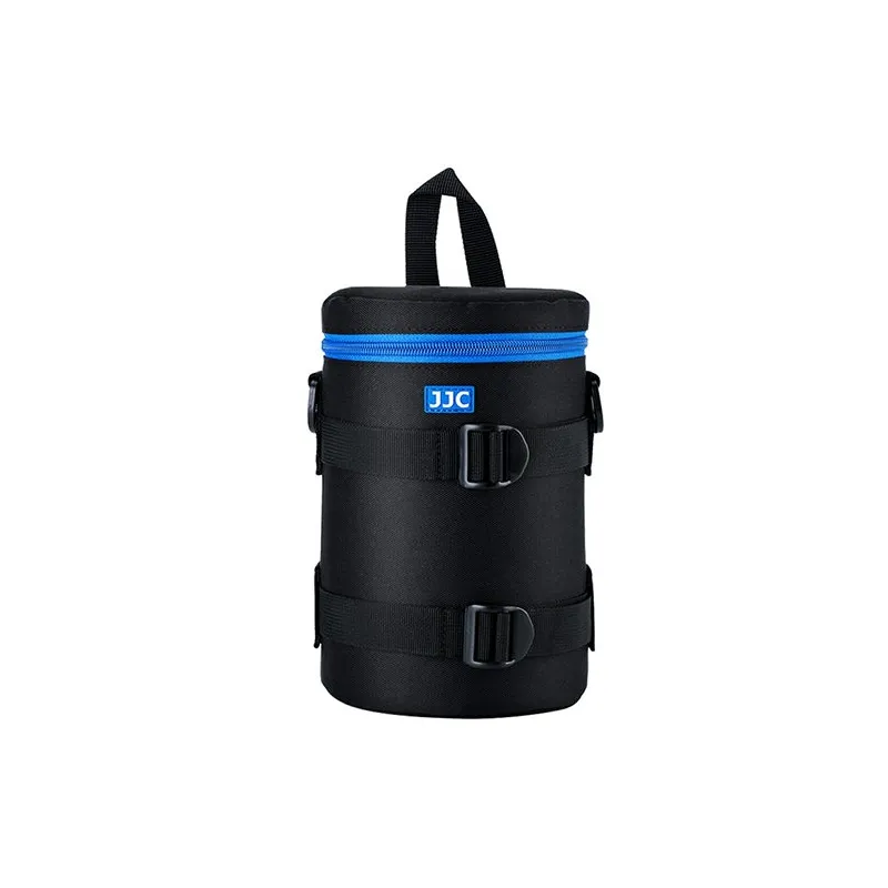JJC Deluxe Lens Pouch is designed to carry a typical SLR lens. This pouch features heavy-duty polyester construction with a foam cushion interior. It provides great protection and shock absorption for your lens. Besides, its exterior material is water-resistant, which can protect your lens from rain and moisture. It has deep blue two way zipper with a mesh accessory pocket inside the lid. The two zipper sliders are designed with small loops, thus you can lock them together with a small lock for security. You can put the small accessory, such as lens cap or remote controller, into the inside pocket. Features 4 carrying options: 2 D-rings with a strap to be used as a shoulder strap, 2 webbed eyelet loops for a shoulder strap, rear double touch belt loop for use on waist belt and a grab handle on the top for convenience. In addition, the narrowed rear double touch belt loop also fits Lowepro belt. The deep blue zipper coordinate with the JJC logo, which makes the pouch fashionable. This series of lens pouches is available in 7 sizes to fit a wide variety of lenses.