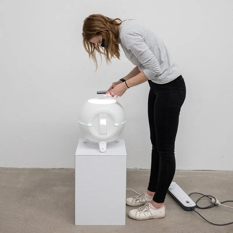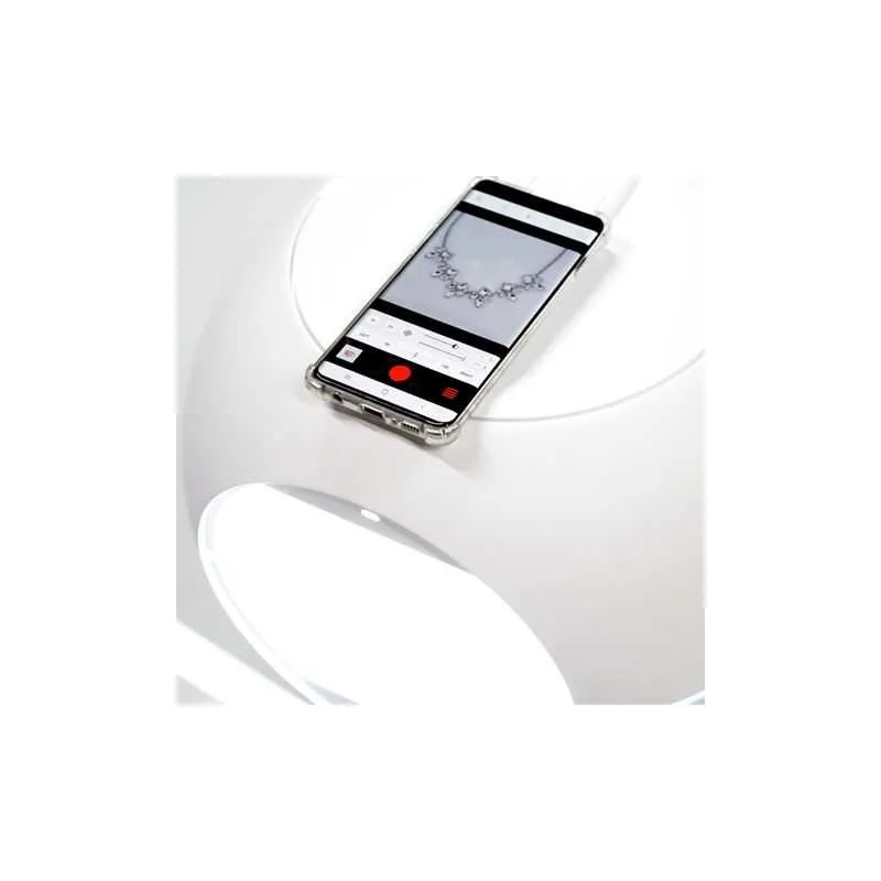 On both the front and top of the Smart Dome you will find an opening. This makes it possible to record both products that are placed flat on the turntable, through the top, and products that are standing upright, through the front. There is a separate smartphone holder available (see optional accessories) which allows you to easily take pictures from the right angle. On the top you will find two flexible clips to attach (for example) a chain.