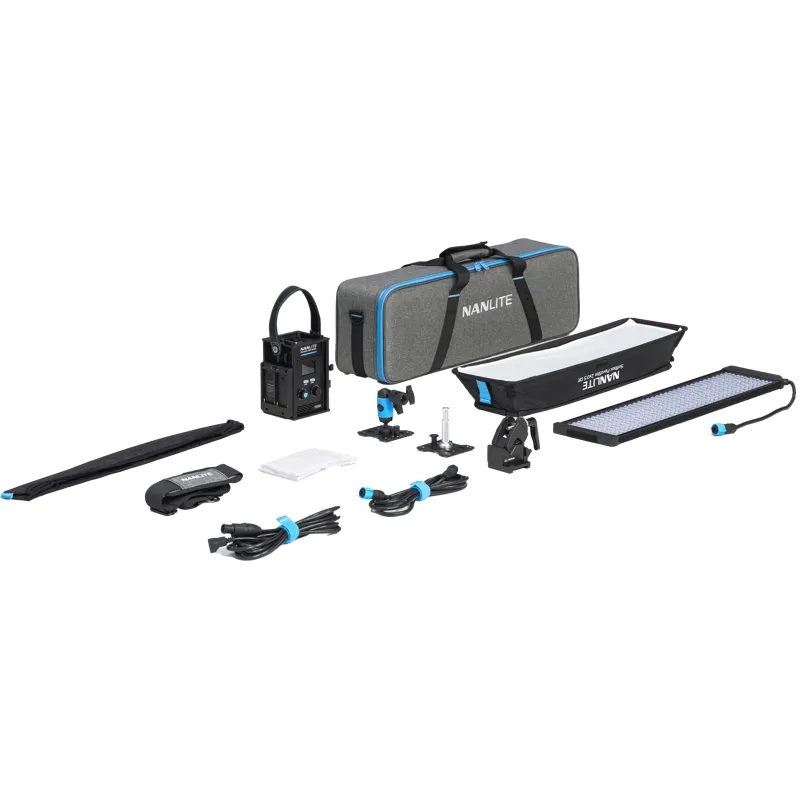 The kit includes a softbox, carrying bag, control block, mounting bracket, power cables, diffusers, eggcrate, and user manual for convenient setup and storage.