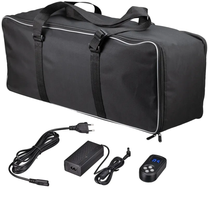 The robust luminaire kit includes high-quality tripods with a maximum height of 200 cm and a practical transport bag in which everything can be quickly stowed away.