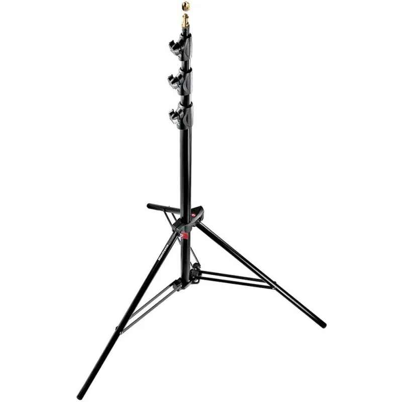 This is a Manfrotto 1004BAC-3 master light stand pack of three. Each stand in this set is a 4 section, 3 riser aluminum light stand with a black anodized finish that extends to a maximum height of 4 m.
