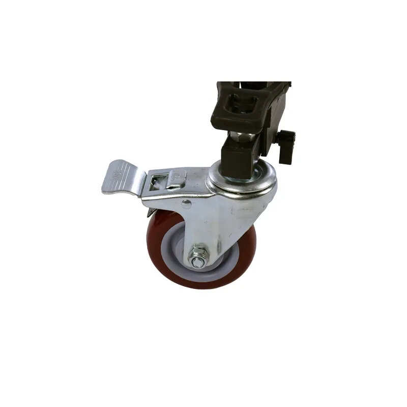 The Falcon Eyes PT-80 Heavy Duty Universal Tripod Dolly is compatible with most light stands and tripods and is particularly suitable for heavy-duty light stands and tripods. The PT-80 has a maximum loading capacity of 80 kgs making it suitable for use with heavy-duty studio equipment. The PT-80 is equipped with adjustable screw clamps, enabling you to secure almost any light stand or tripod. The wheels are lined with rubber to prevent damage to the floor and equipped with a brake, enabling you to position the PT-80 where you wish. When folded, the PT-80 has a length of 57 cm making it suitable to take with you on location.