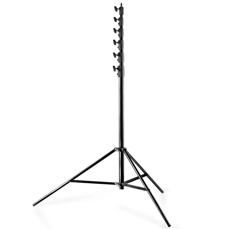 The excellently processed Jumbo Lamp Tripod with a max. height of 730cm is the ideal assistant when you aim high. If common tripods are not sufficient for you, because you would like to illuminate e.g. furniture or cars from above, you can heighten the walimex Lamp Tripod again and again over 5 sections. You can use studio flashes or reflectors up to a weight of approx. 15kg. But it is also the ideal assistant for banner ads, flags and so on. The air cushioning provides the necessary reliability when lowering the individual stand elements. With the standard spigot connection 5/8 inch, the Tripod is suitable for all common studio lights and flashes.