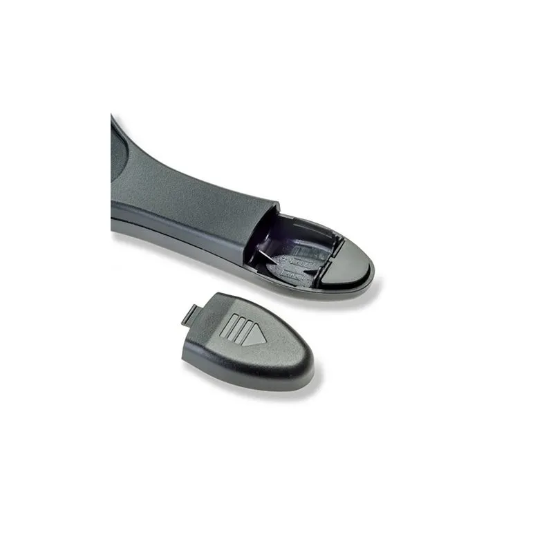 To further magnify small sections, it has a spot lens (7x magnification). This is located on the grip. The magnifier is equipped with an ergonomic plastic handle. The magnifier has built-in LED lighting, which you can power using two AAA batteries (not included). You install these batteries in the compartment at the bottom of the handle. You can manually turn the lights on and off and you can also set the LEDs in two brightness levels. You control this by means of the slider on the housing.