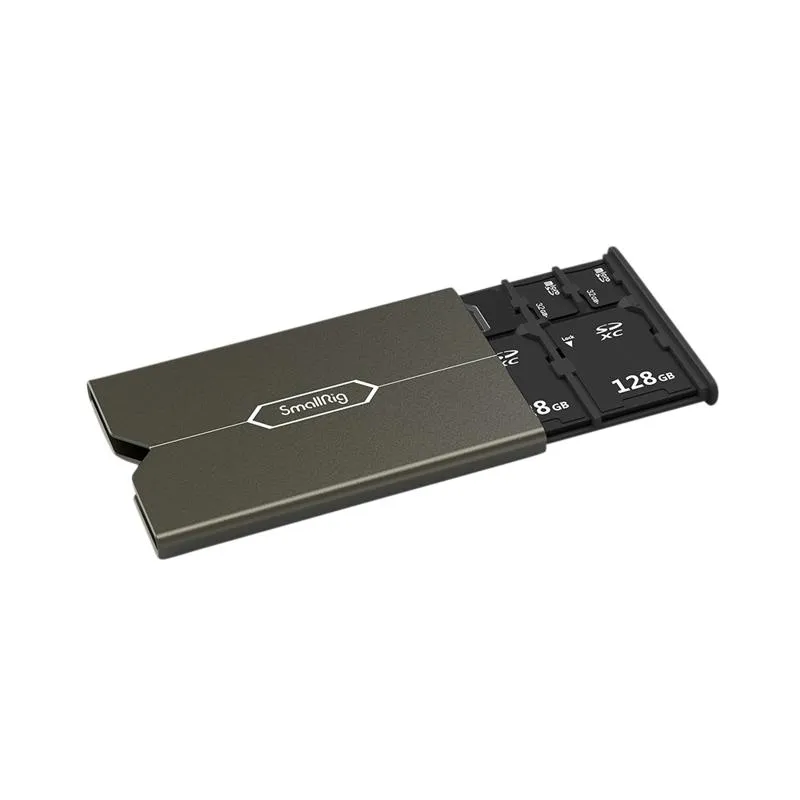 SmallRig Memory Card Case 2832 is an auxiliary product for photography enthusiasts. It can store three SD Cards and two Micro SD Cards, which is convenient for storing the memory cards of cameras, action cameras, drones, and mobile phones. Each memory card has an independent safe space, which can quickly and safely slide into the card slot for storage. The memory card case also comes with a SIM card holder and a SIM card tray pin, which is convenient for consumers to change the mobile phone card when they go abroad or when business needs. It`s compact and easy to store. The outer shell is made of hard aluminum alloy, and the inner case is made of ABS+PC material. It uses a pull-out structure to facilitate quick access to internal items.