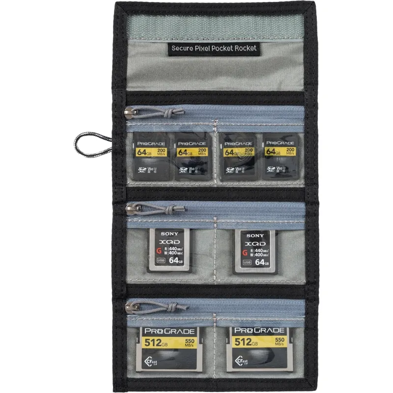 Photographers need to keep track of memory cards. This convenient pocket can hold 6 CFast or CFexpress Type B cards, or 12 SD or CFexpress Type A cards, or multiple microSD memory cards. It easily fits in a pocket or can be attached to a belt or bag.