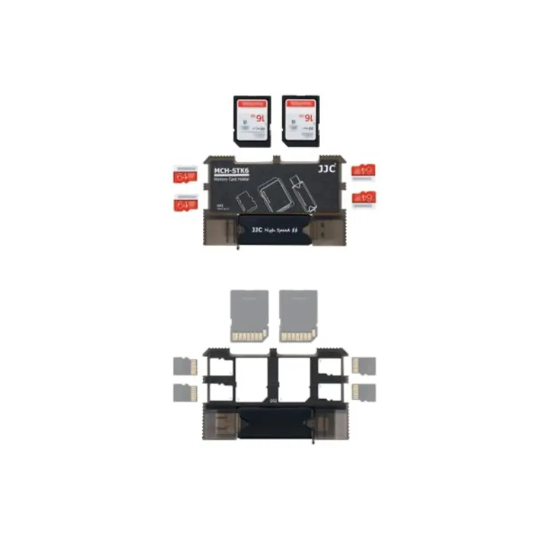 Thanks to the JJC MCH-STK6GR Memory Card Holder Kit, you have all your memory cards in one place. The card holder has room for two SD cards, four Micro SD cards and one USB 3.0 card reader. You click the memory cards firmly into the right holder, so they stay safely in place. The Memory Card Holder Kit is made of sturdy ABS material.
