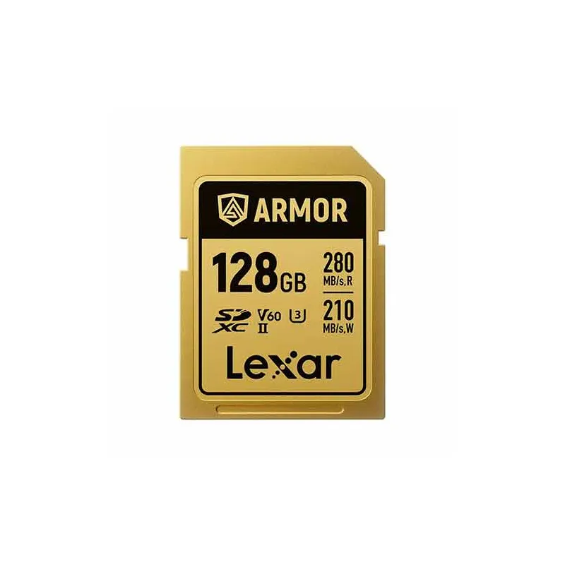 The card information is laser-engraved on the Lexar SDXC Pro Gold Series ARMOR UHS-II V60 IP68 Stainless Steel memory card, ensuring a lifetime visibility of important card details.