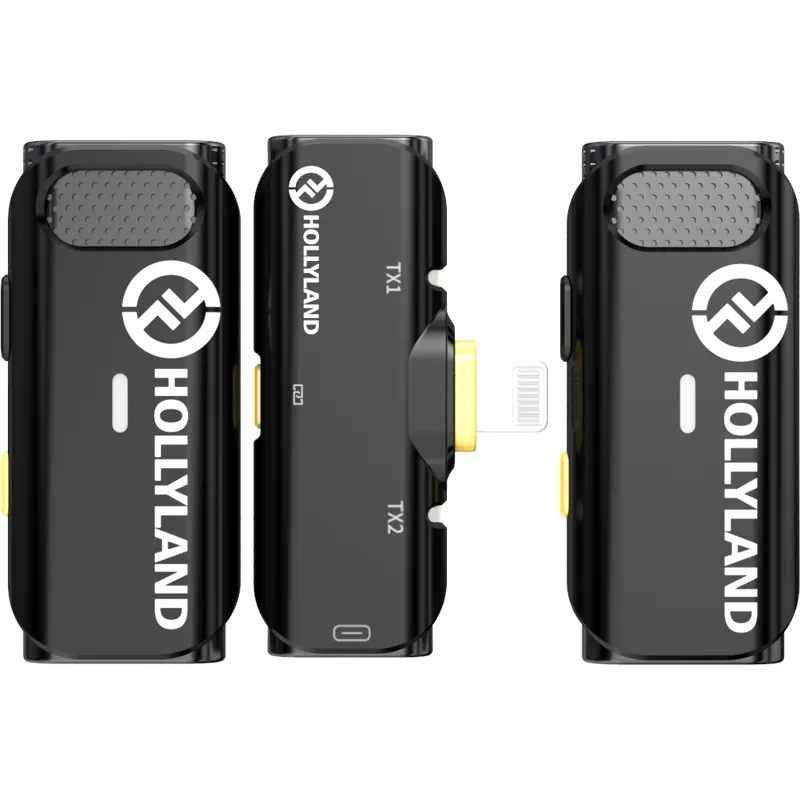 Record up to two people to your Lightning-equipped iOS device for mobile journalism or content creation, using the black LARK C1 DUO Wireless Microphone System from Hollyland. The system includes two transmitters with built-in, omnidirectional microphones and one dual-channel receiver—all with a compact form factor. Clips on the back of each transmitter allow you to attach them to the lapel of a shirt, while the plug-in receiver attaches directly to the Lightning port on your smartphone or tablet, which also supplies it with power.