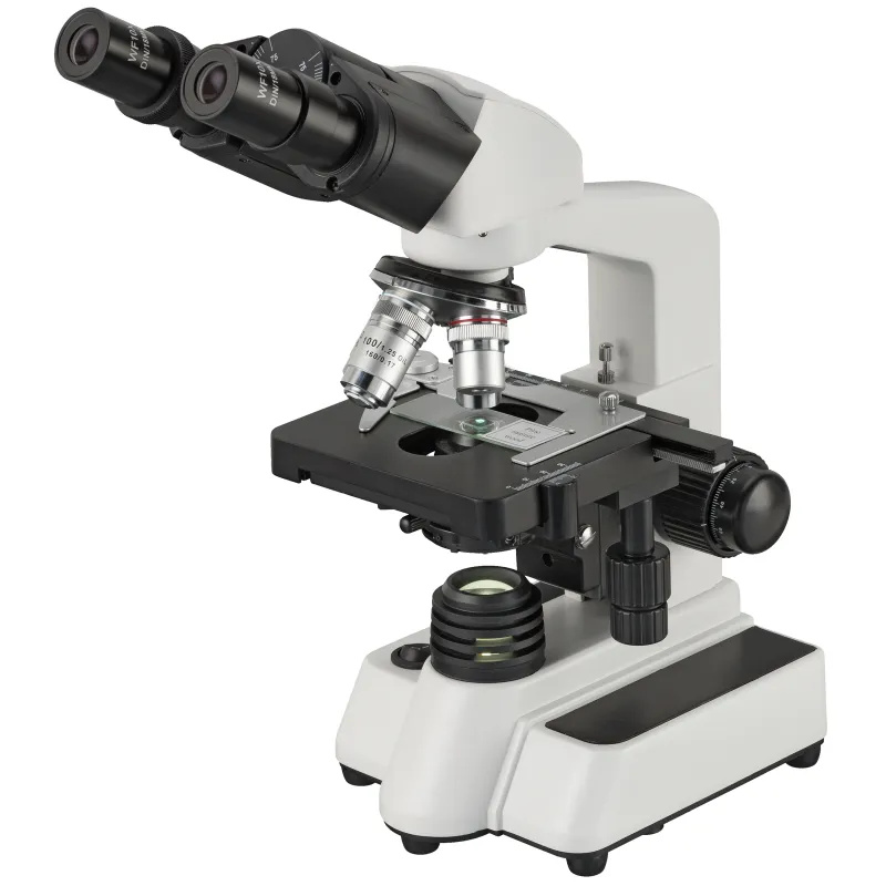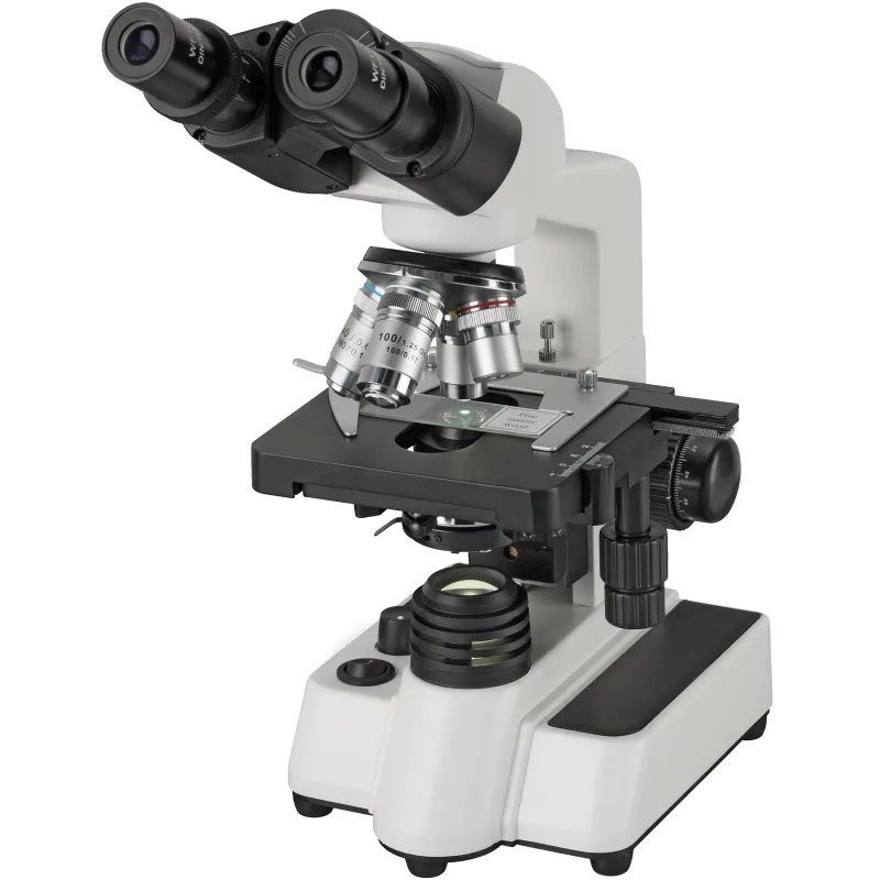 The Researcher Bino is a professional microscope with transmitted illumination, equipped with brilliant optics, a robust metal body, and precise workmanship. It is perfect for use in school, studies, and occupation. The comfortable binocular head provides an exceptionally bright image and can be individually adjusted according to the observer's needs. The objective turret is fitted with 4 DIN objectives and offers a large variety of magnification possibilities. Focusing is done through the use of the coarse and fine adjustment wheels. The illuminator and the double-lens condenser with iris diaphragm guarantee the perfect illumination of the observed object.
