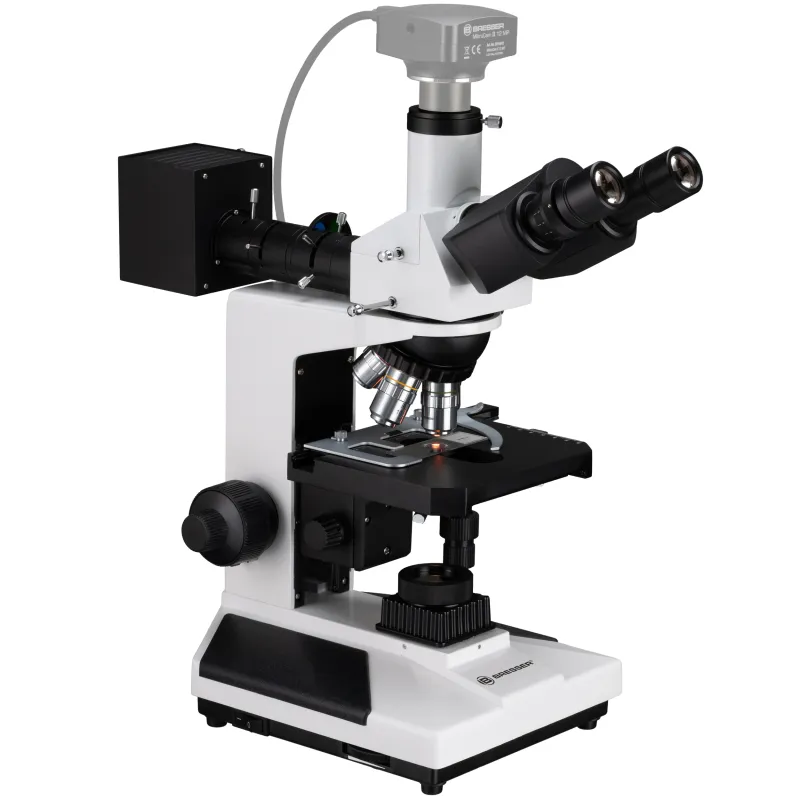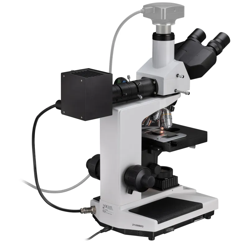 In the microscope's basis, there is a transmitted light halogen illuminator (20 W) as well as the power supply and the continuously adjustable dimmers for reflected light and transmitted light. The trinocular head attachment works with both illumination modes. It also allows photography and binocular visual observation. The inclination of the eyepiece tubes is 30 degrees. With the polarization head attachment, the instrument is suitable for the internal structure of materials and for condition monitoring of different mechanical apparatus in college and factory.