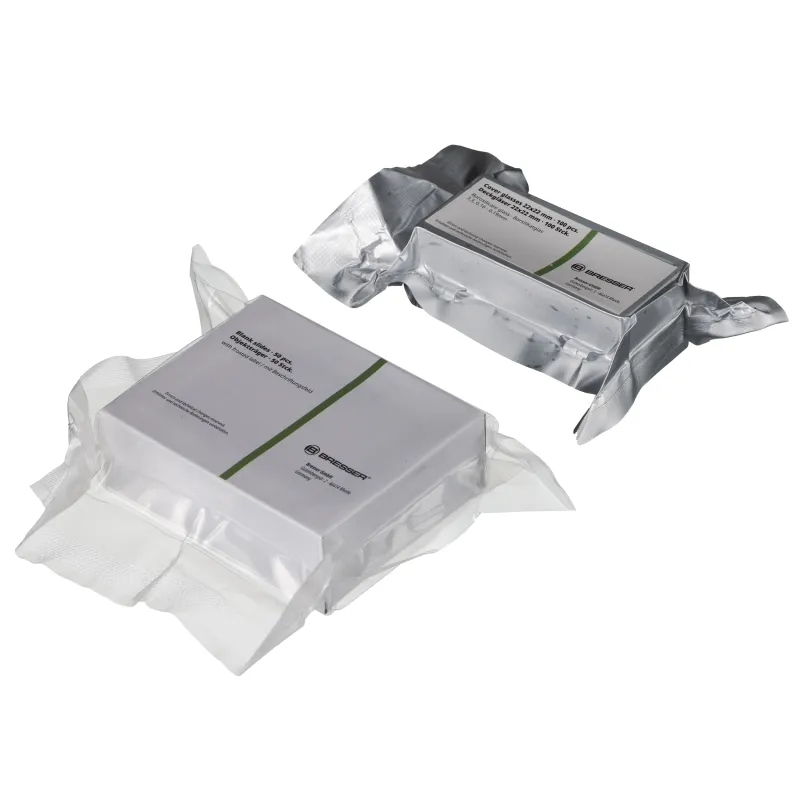 The slides are made of soda lime glass and have ground edges for safe handling. They feature a matte field for writing on both sides (top and bottom). Slides and cover glasses are packed separately in a vacuum sealed bag, containing moisture absorbent. They can be stored for a long time without loss of quality from hydrolysis and are easy to take out.