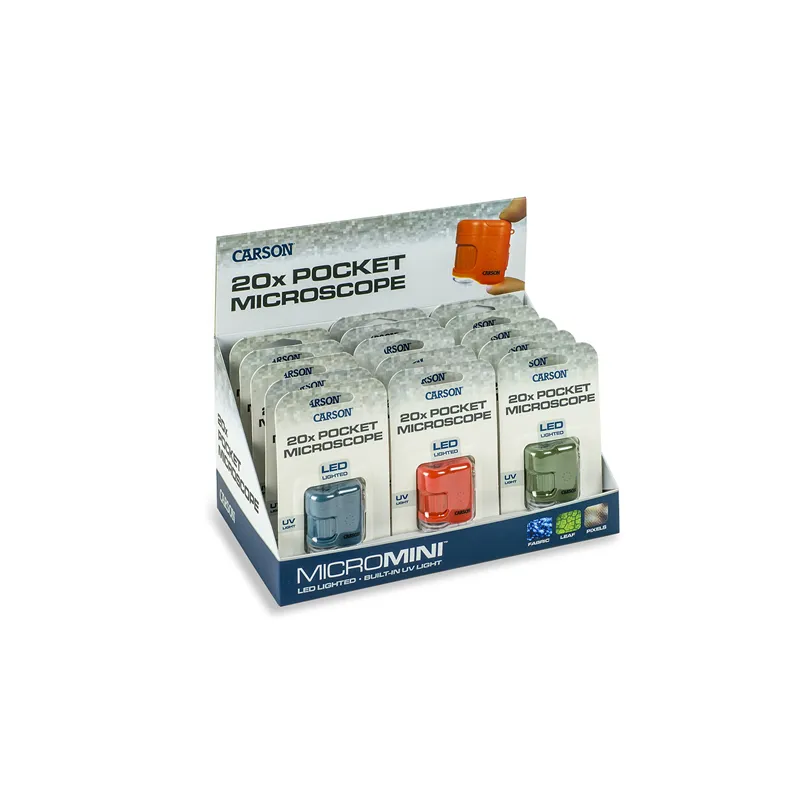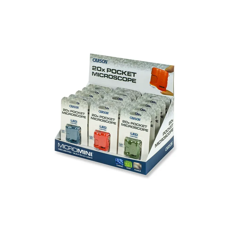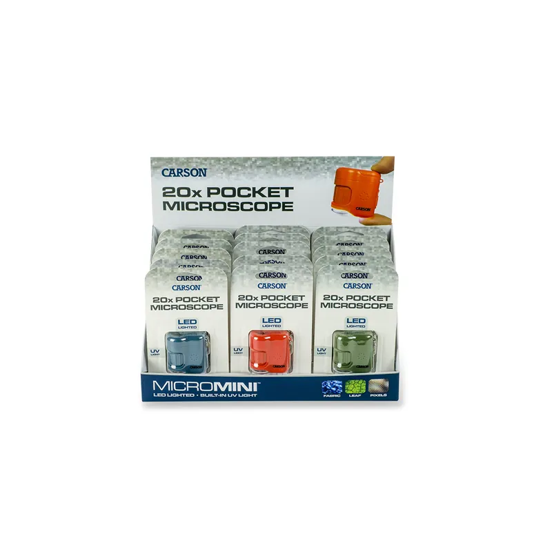 This display consists of 15 Carson Pocket Microscopes (5x Orange, 5x Green, and 5x Orange) at an attractive price!