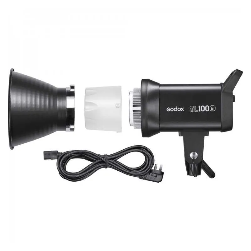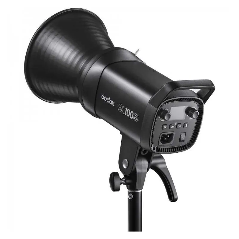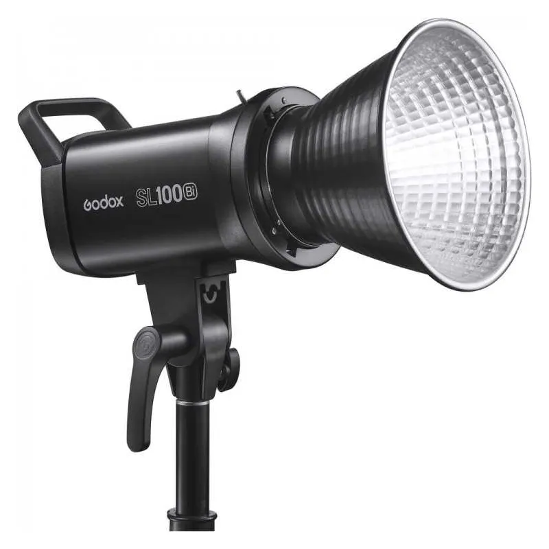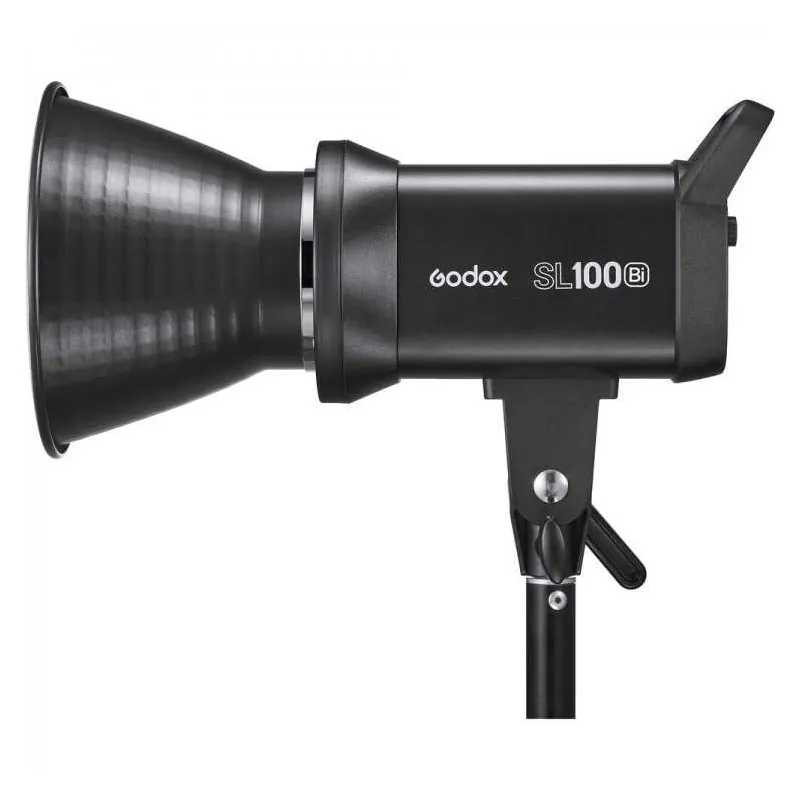 Godox SL100Bi LED Video Light Two Light Kit Godox LED SL100Bi BI Color The Godox SL100 series are two compact 100W light untis with high brightness, the SL100 Daylight & Bi Color work well for small locations where you need light. Daylight is more of a standard multi use solution while the Bi Color gives you the opportunity for more creativity. The Bowens mount makes it easy to choose accessories like reflectors, softboxes and striplights. The compact SL100Bi Color is a high CRI and TLCI chip on board LED lamp with one Bowens mount. The maximum 100W output is Bi Color, which means you can adjust the colour temperature between 2800 and 6500 Kelvin. You can change the settings by adjusting it on the lamp, you can use the Godox Light app or an optional remote control. The lamp is powered by a standard DC cable (V Mount powered is not possible).