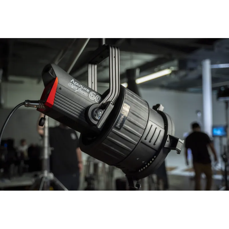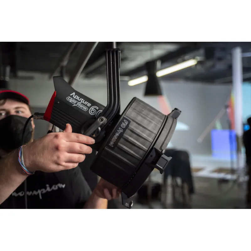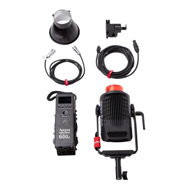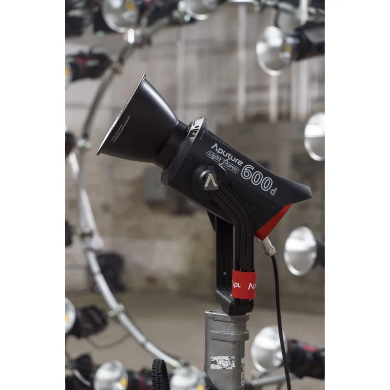 The LS 600d Pro Light Storm Daylight LED Light from Aputure is a powerful COB LED fixture with expansive power, control options, and output comparable to a 1200W HMI, augmented by its 55° Hyper Reflector. The precision fixture has a solid 5600K color temperature with a high CRI/TLCI rating of 96 that is great for location shooting outdoors, or in areas dominated by other daylight-balanced fixtures such as HMIs. Besides power, control is a driving force in the design of the 600d Pro. The light also has a myriad of wireless control methods, such as the included 2.4 GHz remote, the Sidus Link mobile app, and the built-in wireless DMX control. It has four dimming curves: Linear, Exponential, Log, and S-Curve, to ensure accuracy regardless of your chosen brightness level. While you can make adjustments locally on the fixture, you can also make them wirelessly at a distance up to 328' via these methods - a real attribute for lights mounted overhead or in hard to reach places.