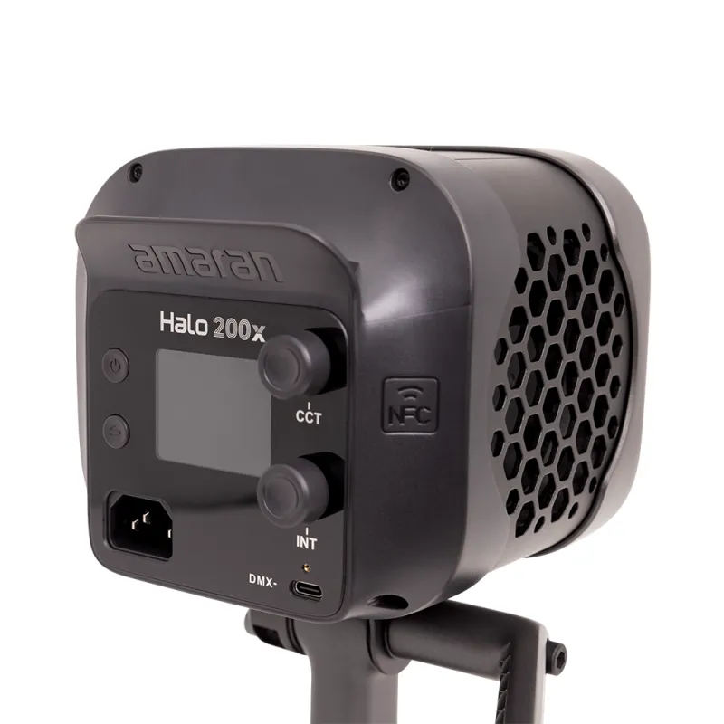 The Halo 200x is a practical lighting solution for content creators and videographers in need of a powerful studio-quality light for small to medium-sized spaces. The lighting adjustments can be made onboard with an intuitive TFT screen that has a simplified colored menu or wirelessly from a distance of up to 262 using your smartphone and the amaran app featuring one-tap NFC capability. Control of the Halo 200x is available on the fixture itself, via Bluetooth, or with an optional DMX adapter. Onboard control was simplified with separate brightness and color temperature knobs for quick, uncomplicated operation. Start creating faster with no external power accessories. Thanks to its streamlined, monolight-style design, the Halo 200x is powered by a single, included AC cable.