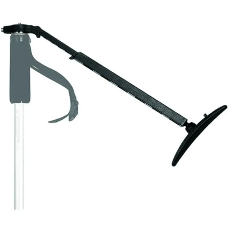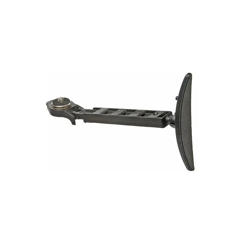 The Manfrotto 361 Shoulder Brace for Monopods is a bracket that fits against the shoulder to provide extra support and greater stability to a monopod. One end connects to the top of the monopod via the monopod's 3/8" screw, and the other end features a curved shoulder support, with an adjustable pivoting arm in between.