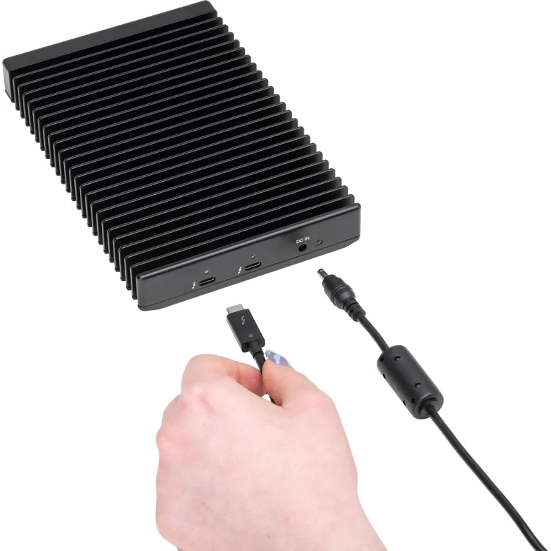 **Mājās un ceļā ** Izstrādāts, lai būtu izturīgs un uzticams, kā arī ļoti ātrs, ThunderBlade ir vienlīdz labi piemērots gan ceļā, gan filmēšanas laukumā vai montāžas kabinetā. Tas ir pietiekami kompakts un izturīgs, lai izturētu pat visnežēlīgāko apstrādi, pārvietojoties starp vietām, un tam ir pievienots ballistiskais cietais apvalks, kas nodrošina vēl labāku aizsardzību. Ar diviem Thunderbolt 3 portiem ThunderBlade lieliski iederas jūsu darba plūsmas ķēdē.