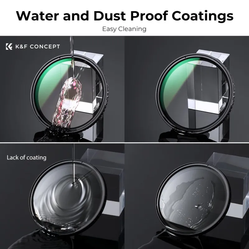 K&F Concept ND Filters are crafted from professional optical glass rather than optical resin, effectively reducing light intake without impacting overall color balance. For the 52mm ND filter, a 55mm lens cap or hood is recommended. An important note is that due to a product packaging update, the new and old versions will be sent randomly. These filters say farewell to the X cross issue commonly encountered with wide-angle lenses and variable ND filters thanks to cutting-edge technology. K&Fs optical engineers have developed a Nano coating layer thats waterproof, scratch-resistant, and boasts an anti-reflective green coating, guarding your valuable lens against oil, fingerprints, and scratches. The filters feature an ultra-slim rim design to prevent wide-angle vignetting, and their rugged aviation aluminum frames ensure durability and prevent jamming. To ensure compatibility, please verify your cameras lens thread size, usually marked on the lens barrel or printed under the lens cap, always preceded by a (diameter) symbol. For example, 52 indicates a 52mm lens thread size.