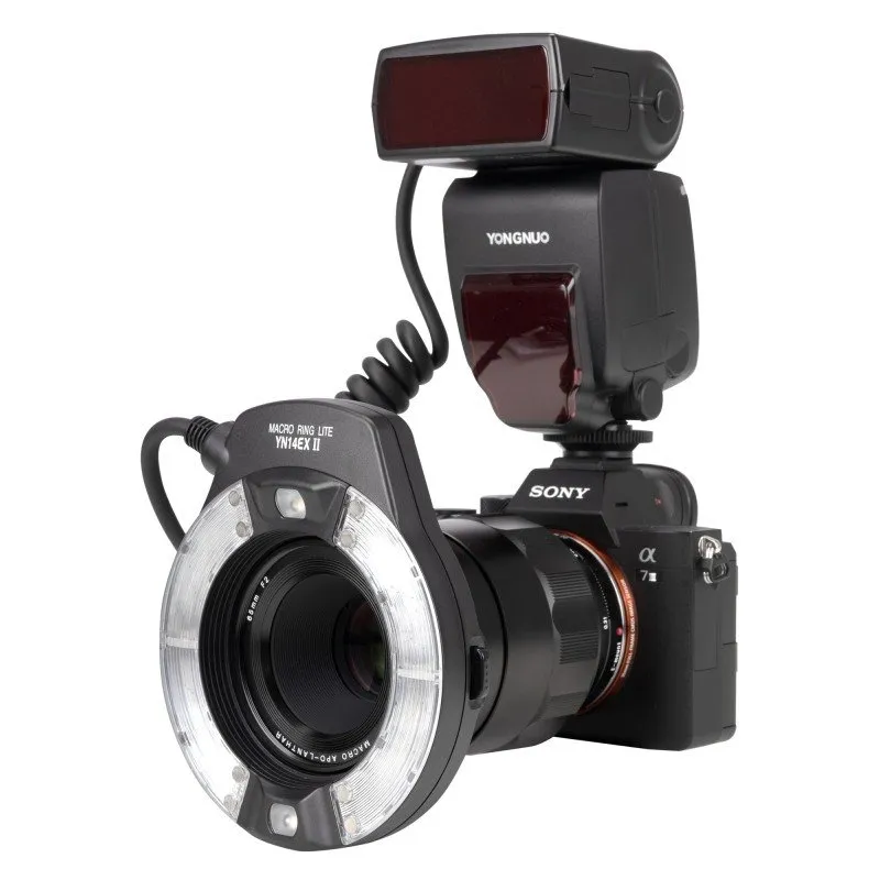 Yongnuo has put together this YN-14EX II TTL Macro Ring Flash Kit for Sony for photographers who require a lightweight solution for soft, detailed, wrap-around lighting for close-up work. The kit includes the TTL-compatible, shoe-mount control unit and a ring flash with 52, 58, 67, and 72mm lens adapter rings. Four snap-on CT filters are provided for fine-tuning the flash's 5600K output, while a carry bag is included for storage and transport.