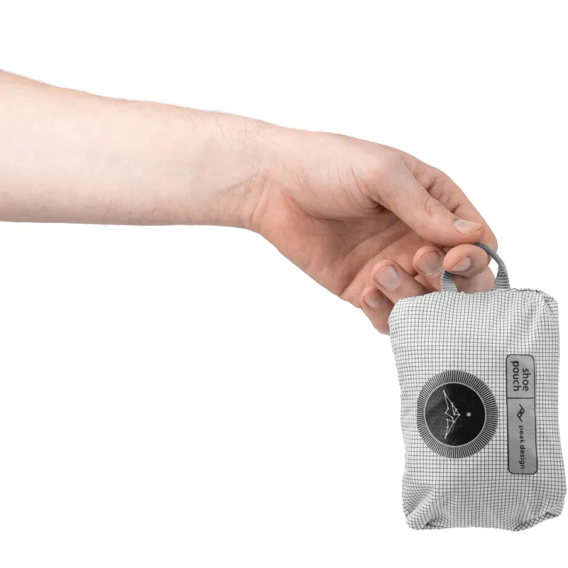 Strong, ultralight, and ultra-packable, the Shoe Pouch provides basic storage for shoes or clothes. It works great with any suitcase or bag and is sized to fit perfectly into any bag in the Peak Design Travel Line. Uniquely patterned from a single piece of self-healing 70D nylon, the Shoe Pouch weighs in at a feathery 48 g. When youre not using the Shoe Pouch, stow it in the integrated storage pouch. Its a perfect little bag to have on hand in case you need more storage or organization mid-trip. Typically, it fits 1-2 pairs of shoes, depending on size.
