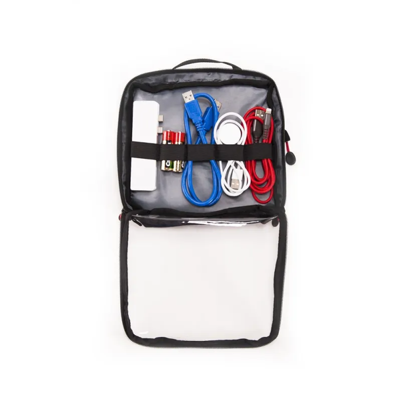 Create one big space for cable storage by removing the divider in the middle. On the back you will find a compartment with a plastic viewing window and without dividers where you can store even more cables and accessories. Carry the bag with you with the hand straps on the top or attach it to your belt with the belt loop on the back.