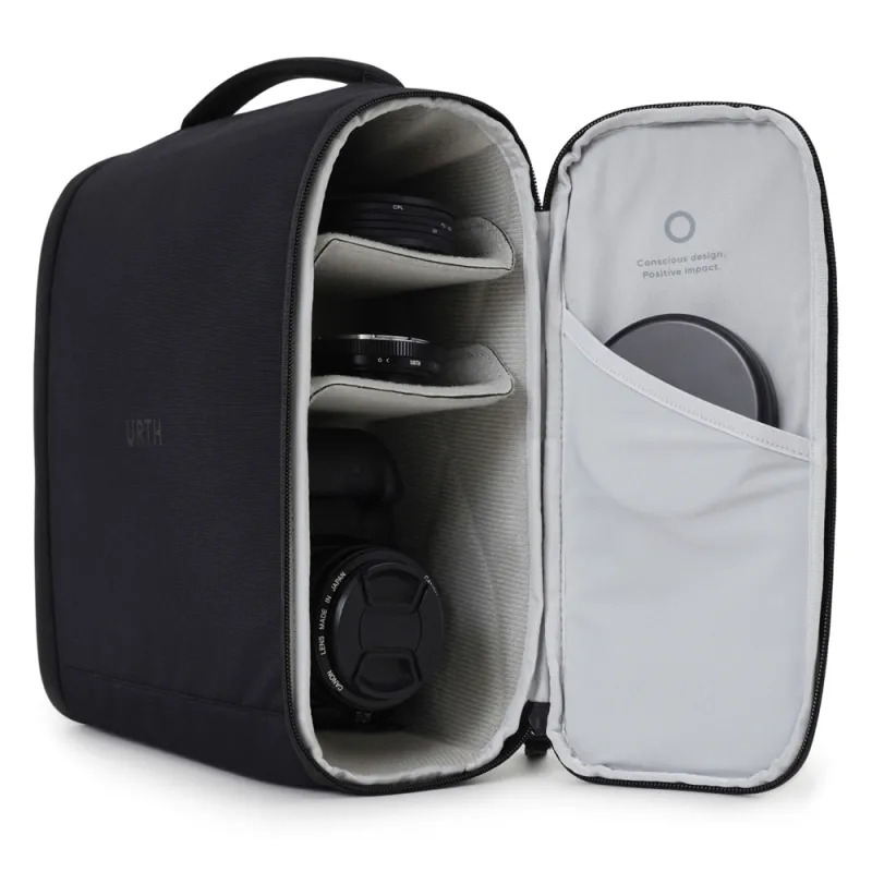 The medium-sized insert fits a DSLR, three lenses, and a filter set with enough space for batteries and memory cards. It fits exactly into the main compartment of our 24L backpack.