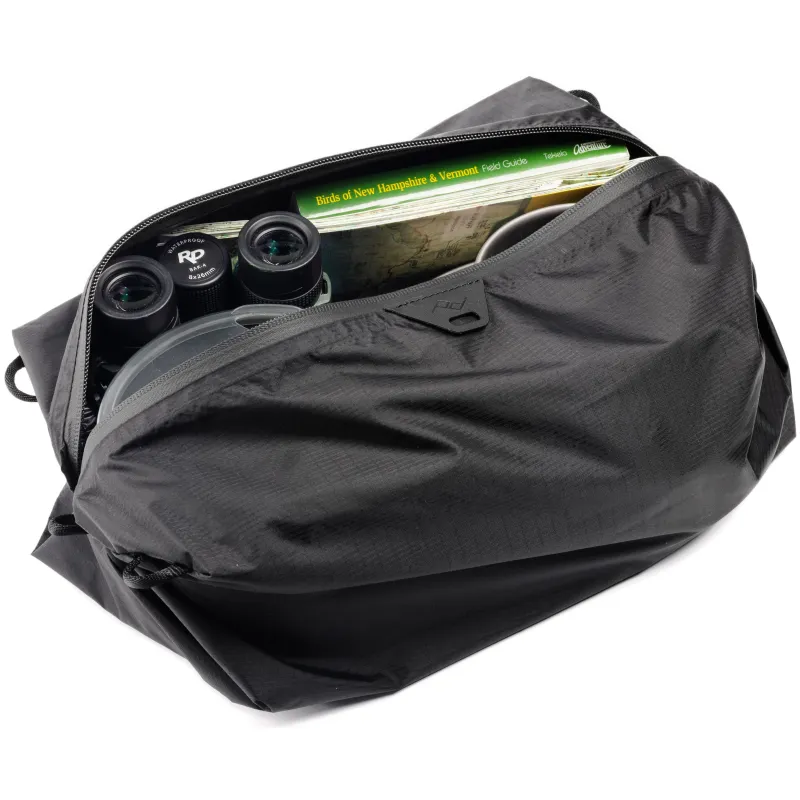 The bag can be turned into an ultra-light shoulder bag by attaching the adjustable carrying strap or the Peak Design camera strap to the Packing Cube Cord Hook™ carrying loop (straps sold separately). The bag can also be attached to any Peak Design bag using the two external strap loops. Cord Hook™ loops can also be used as drawstrings, making it easier to open and close the bag.