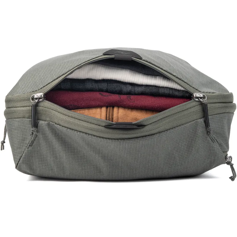Compressible, easy to access, and instantly dividable, Peak Design Packing Cubes are functionally and aesthetically unmatched. A unique tear-away zipper lets you access contents quickly, unlike standard packing cubes with U-zip openings. An internal divider lets you separate clean and dirty clothes, and allows each compartment to expand/contract based on its contents. And, an expansion/compression zip provides additional space, or the ability to compress contents once packed. Outer shell is a beautiful, self-healing 70D nylon/poly blend.