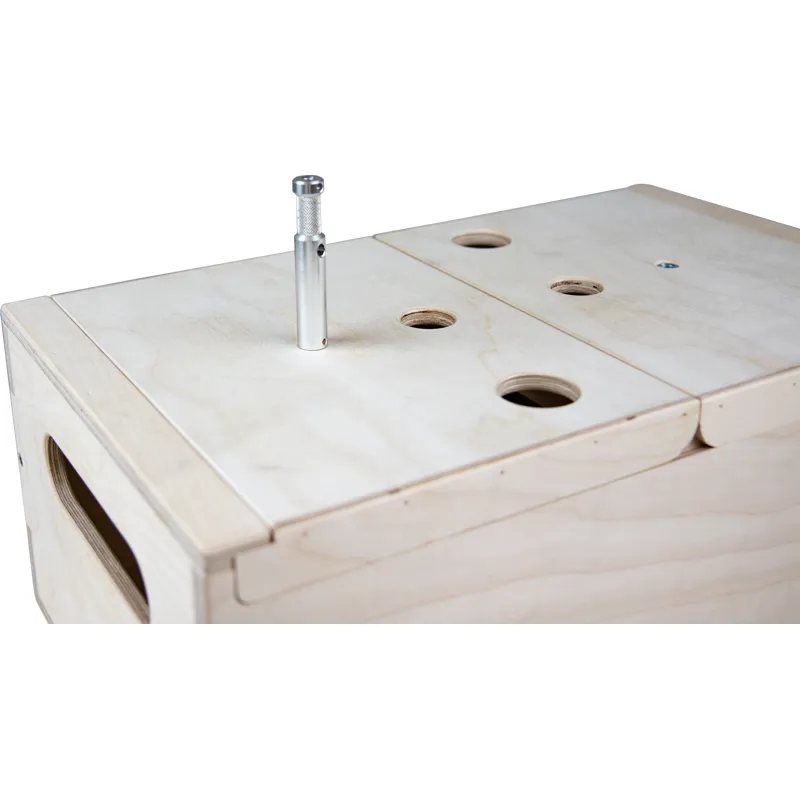 The Tooling Apple Box is equipped with a 3/8 thread female on either cover, allowing you to mount a baby pin with a 3/8-16 screw for small lighting or other accessories. The innovative track with a locking latch system enables you to slide and lock the cover with ease and convenience. Additionally, the spring locking pin securely keeps the cover mounted on the box, and a hole on the short lateral side for handling prevents items from falling out when the box is in an upside-down position.